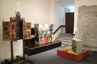 Mustapäiden lahjoittama on myös tämä Neitsyt Maarialle omistettu alttaritaulu, tässä avattuna. Tekijä tunnetaan Pyhän Lucian legendan mestarina ja hän on vaikuttanut Bruggessa.